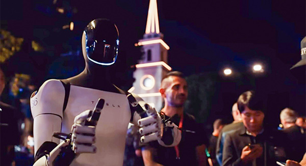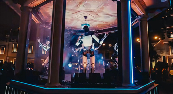 もうひとつの大きなトピックとして登場したヒューマノイド「オプティマス」。多くのオプティマスが人々の間を動き回り、滑らかな動きでダンスを披露している(ヒューマノイドの一部の動作は遠隔操作で行われているが、ヒューマノイド開発において、遠隔操作か自律動作かは重要なトピックではない)。