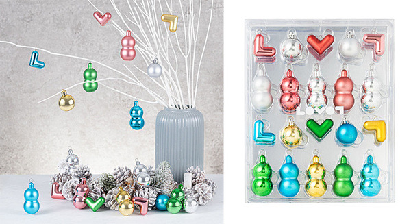 詳細 | 20個セット 【素材】オーナメント:ポリスチレン / パッケージ:PET 【サイズ】LOVOT型:高さ7.5㎝×直径4㎝くらい L型:縦4㎝×横4㎝×厚み1.7㎝くらい ボール型:直径4㎝くらい 【生産国】中国 |