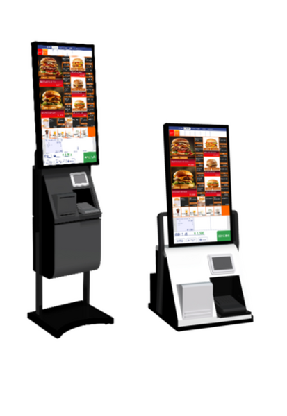 オーダーエントリーシステムと大画面キオスク端末が連携。大型ディスプレイにより操作性や商品訴求力を向上。メニューの選択から会計まで、利用客が操作するセルフオーダー、セルフ会計を支援する機器。人手不足の改善とPOSレジとキオスク端末のマスタを同期することでマスタ管理における業務負担削減に貢献する。