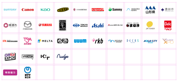 サントリー株式会社/キヤノン株式会社/花王グループカスタマーマーケティング株式会社/キーン・ジャパン合同会社/株式会社 大丸松坂屋百貨店/株式会社ユニバーサルエンターテインメント/サミー株式会社/静岡競輪場/山形県/愛知県豊田市/静岡県焼津市/マツダ株式会社/ヤマハ発動機株式会社/株式会社Robot Consulting/株式会社東京マルイ/アサヒ飲料株式会社/株式会社みすずコーポレーション/まねき食品株式会社/札幌駅総合開発株式会社/株式会社ベルク/富士フイルムビジネスイノベーション株式会社/株式会社BeBlock/独立行政法人情報処理推進機構/SO.ON project LaV 東京スクールオブミュージック&ダンス専門学校 高等課程/株式会社メルタ/株式会社diVRse/UUUM株式会社/RKB毎日放送株式会社/株式会社ゆりかもめ/デックス東京ビーチ/アクアシティお台場/Vtuber Expo/OffKai Expo/VRChat/合同会社Kit/ナッジ株式会社