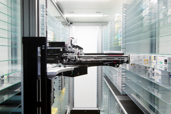 今回、「薬局24」の内部の「調剤ロボット」も報道関係者に公開した。調剤ロボットと呼んでいるが、基本的には処方された薬を棚から取り出すピッキング作業を行うロボットだ。ロボットの稼働時には薬剤室に人の立ち入りが禁止されているため、接触事故の心配なく、ロボットはかなり高速に動作する。