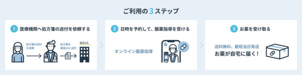 処方薬は「薬局24」の所在地である東京都渋谷区から、日本郵便のゆうパック、またはゆうパケットで配達される。利用者のメリットとしては、診察を受けた後、薬局に行って処方薬を受け取るまでの待ち時間が発生するが、宅配で受け取ることができるようになることで薬局への移動時間と待ち時間が削減される。また、薬局での他の疾病の感染リスクを避けること、薬局での会話によるプライバシー情報の流出などの心配から解放される。