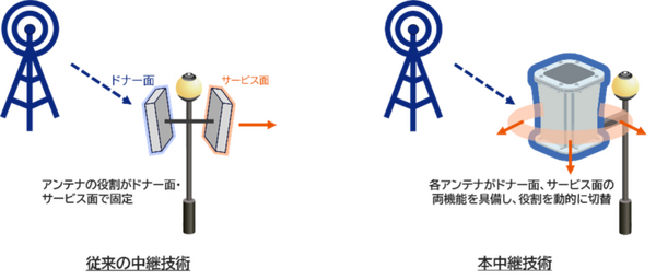 従来の中継技術では、基地局から受信するアンテナをドナー面、増幅して送信するアンテナをサービス面と役割を決める中継方法が一般的であり、エリアを構築する上では、基地局に対して各アンテナの役割と指向方向を調整する必要があった。
