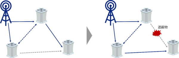 開発された中継器は、複数の方向から受信するミリ波電波のうち、最も無線品質の良い中継ルートを選択し、メッシュ状のエリアを形成する。ミリ波基地局または隣接の中継器から受信する信号の劣化を検知した場合、最適な中継ルートを計算し、瞬時に切り替えを行う。建物建設や樹木などの環境変化により中継ルートが遮蔽された場合も、常に最適な中継ルートを自律的に選択し、最適化を行う。