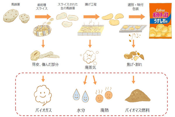 工場で使用するじゃがいもを余すことなくエネルギー等に転換することで、省エネ・脱炭素化・廃棄物削減に寄与する。