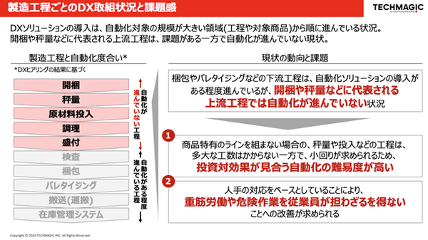 コンソーシアムの参加企業間で実務者会議や工場見学を行い、共通課題の洗い出しを行った。その結果、DXソリューションの導入は自動化対象の規模が大きい領域(工程や対象商品)から順に進んでいることがわかった。一方で、開梱や秤量などに代表される上流工程は、課題があるにもかかわらず自動化が進んでいない実態が浮き彫りになった。