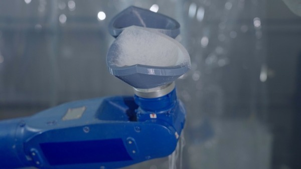 約6平方メートルのスペースに、吹付装置と3体のロボットアームが設置されており、吹付装置に対してロボットの軌道を精緻にコントロールすることで、かたちや厚み、伸度を調整することができる。
