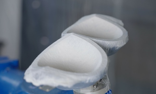 ブラジャーのカップの生産方法は、主にカットソー(生地を裁断・縫製する)とモールド成型(熱を加えた金型でプレスして成型する)の2つがあり、カットソーでは、縫製を行うオペレーターの技術の熟練度に依存する、モールドでは廃棄する材料が多いという課題があった。そのため、オペレーターの技術に依存することなく、材料廃棄を減らすことができる第3の手法を探ることから検討をスタートし、2018年からはメルトブロー法で立体物をつくる技術の開発をスタートした。