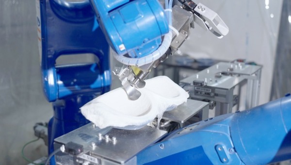 加えて、ロボットの動きをコントロールし、吹付口からの距離や吹き付ける場所、時間を変化させることで、かたちや硬さ、厚み、伸度を調整することに成功し、2020年にブラジャーのカップの生産技術として実用化することができた。