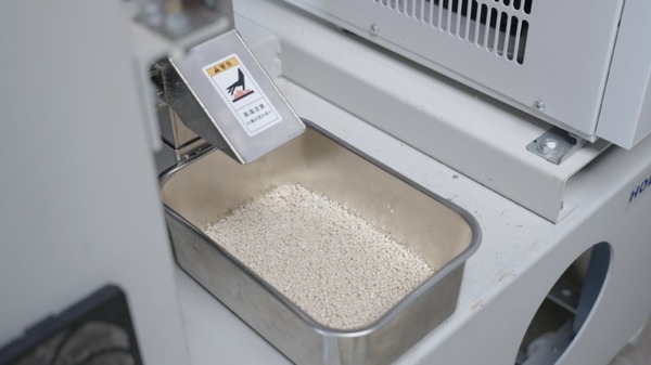 5:破棄材料(カットされた不要なパーツ)は専用装置で熱を加えて溶かすことでペレットにし、再資源化が可能
