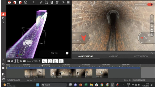 2025年1月28日(火)に発生した埼玉県八潮市道路陥没事故を受け、流域下水管の状況確認が急務となってる。この調査では、GPSが届かない環境でも安定して飛行可能な「ELIOS 3(Flyability 社製、本社:スイス)」を活用し、事故現場の下流約600m付近のマンホールから下水管内の状況を調査した。内部映像とともにリアルタイムに表示される高精度3Dマップを活用した。