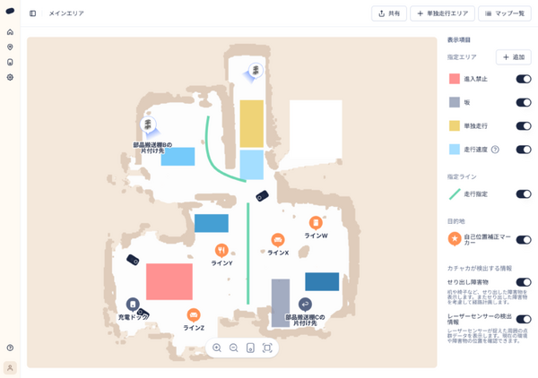・管制管理機能:狭い通路でのすれ違いや交差点での交通整理を自動制御