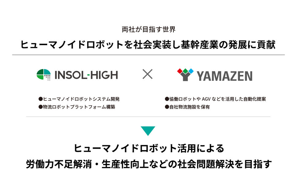 この提携で、INSOL-HIGHのヒューマノイドロボットに対応したWES(倉庫内の作業管理・最適化システム)や物流ノウハウ、山善の生産現場における自動化ノウハウや販売ネットワークを掛け合わせ、多様な業界・現場に適応可能なヒューマノイドロボットの社会実装を目指す考えだ。