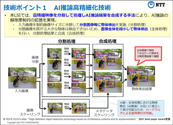 NTT(日本電信電話株式会社)は、4Kクラスの超高精細映像をリアルタイムで解析してAI推論する処理を、エッジ/端末上で実行できる「AI推論LSI」を開発したと2025年4月11日に発表した。発表に先立って、報道関係者向けの説明会を開催した。