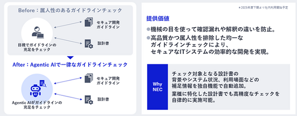 NECは、高品質かつ属人性を排除した均一なチェックを実現する「ガイドラインチェック用 Agentic AI」を開発し、2025年度下期から社内利用開始を目指すとしている。チェック対象となる設計書の背景やシステムの置かれている状況、システムが使われる場面などの補足情報をAgentic AIが自動で追加する独自の機能により、業種に特化した設計書であっても高精度なチェックを自律的に実施可能です。これにより、セキュアなITシステムの効率的な開発を実現する。