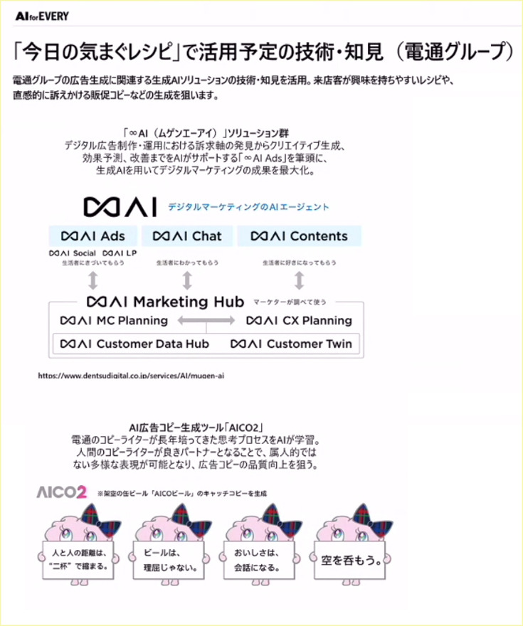 協業の第1弾として、スーパーなど店舗での在庫状況を予測し、生成AIが考案したレシピや広告素材をデジタルサイネージなどを通じて生活者に訴求することで、食品ロス削減などの貢献を目指す「今日の気まぐレシピ」という新たな取り組みに関するフィジビリティスタディ(実現の可能性を探る調査)を開始する。今後、流通業界のニーズも取り込みながら共同でサービスの検討を推進する。