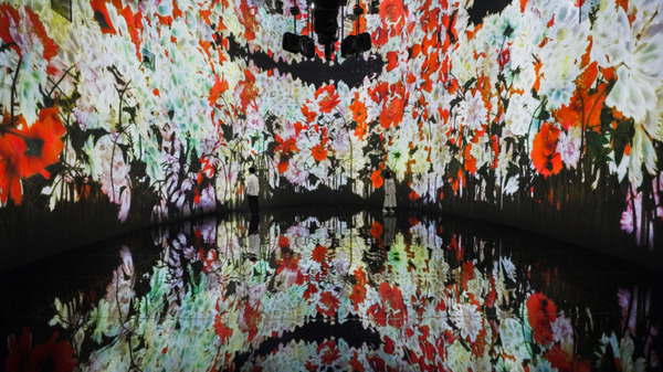 作品世界は、チームラボが考える「超主観空間」によって平面化しているため、レンズやパースペクティブによる平面化とは違い、鑑賞者は視点が固定されず、身体が自由で動的になる。そして、作品世界が映し出された壁は、人々我々と作品との境界面にならず、花は壁の境界面を曖昧にし、作品世界は、人々の身体のある空間と連続する。