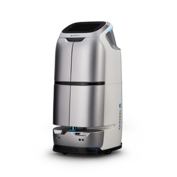 DFA Roboticsが取り扱う搬送ロボット「KEENON W3」は、1度に最大4箇所まで運搬が可能なロボット。パスワードを入力すると開く扉を搭載しており、検体や薬剤など秘匿性の高い搬送にも対応。また、エレベーターと自動連携することで、フロアをまたいだ搬送も可能。