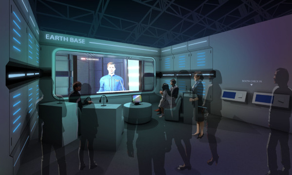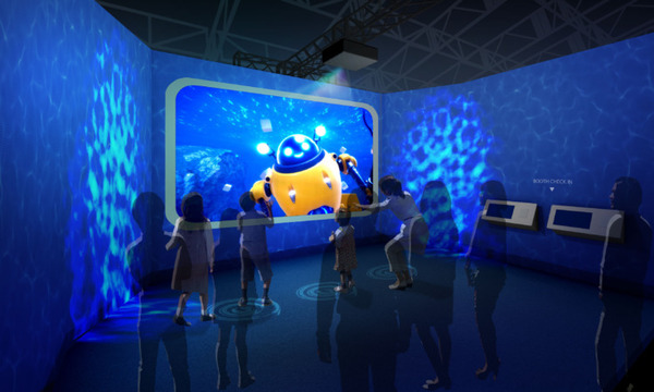 人の動きに連動して動く海中ロボットを遠隔操作し、海洋環境の保全を体験できるシアター型体験ブース。現在は、海中まで無線通信を到達させることは困難。