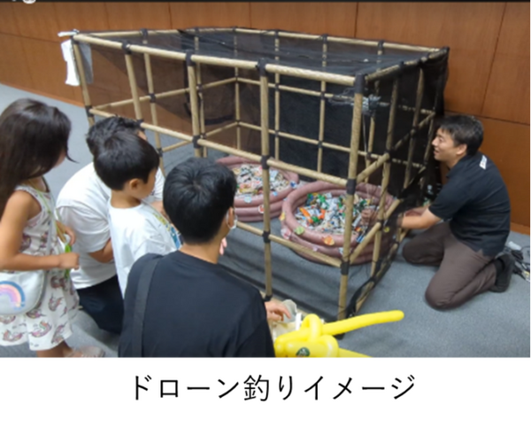 ドローンに取り付けた紐とマグネットでお菓子を釣るドローン釣り。前後左右にドローンを動かして、ゲーム感覚でドローンの操縦を体験することができる。