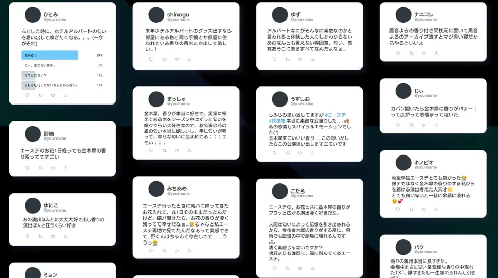 あるライブでは、アーティストがMC中に香り演出に触れたことで、そのワードがX(旧Twitter)でトレンド入りする現象が起きた。視覚演出とは異なる、“記憶と感情に深く残る演出”として、口コミ拡散やSNSにて話題化を促す効果があり、プロモーションにも役立つ。
