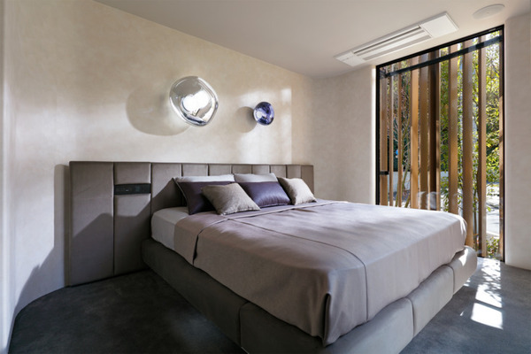 視覚: 外観デザインにはコンピューテーショナルデザインツールを用いながら、日本家屋の生垣を想起するような設計を実現。また、床・壁・外壁など、家の各所に曲線的な造形を施し、従来の“角”を排した有機的なデザインを構築する。これにより、空間そのものが視覚的に呼吸し、変化するような感覚を生み出す