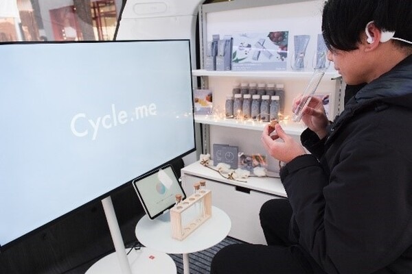 今回の実証実験では、「Cycle.me」ブランドへの没入感を体感できる専用デザインを施した自動運転車「Robo-Shop」において、参加者に「Cycle.me」の各商品の香りを嗅いでもらい、イヤホン型脳波計を用いて参加者の脳波測定を実施。その結果を受けて、生成AIが顧客ごとの測定結果の説明、商品レコメンドを提供した。