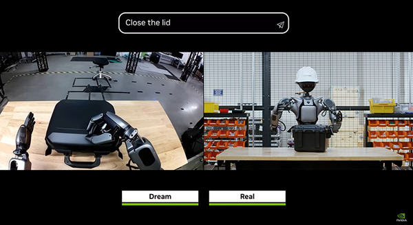 そこでNVIDIAが提案しているのがAIモデル「Cosmos」と「GR00T-Dreams」だ。覚えさせたい作業を人が一度、もしくは数回見せるだけで、それを映像として記録する。