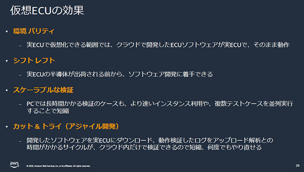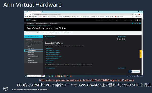 なお、2018年からAWSは、ARM社製CPUを採用したデータセンター向けLSI「Graviton」を自社で設計。ECUで使われるARM社CPUの「Cortex A / M / R」シリーズの命令コードをAWS Graviton上でそのまま動かせる「ARM on ARM技術」を搭載しているため、高精度な「仮想ECU」ソリューションが展開できる。
