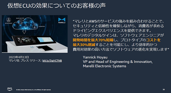 続いて「仮想ECU」の効果について、マレリ社のプレスリリース(2023年4月)を引用。「マレリのデジタルツインは、ソフトウェアエンジニアが開発時間を最大70%短縮し、プロトタイプ開発のコストを最大30%削減することを可能にし、より効率的かつ費用対効果の高い方法でソフトウェアの進化を実現」したことを紹介した。