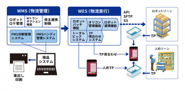 WESはロボットと人間の協働を容易にする機能を標準搭載し、ロボットバッチ、オリコン管理、ヒューマントータルピック、トータルピック似合わせシステム、検品・後出し印刷システムなど多彩な機能を提供している。