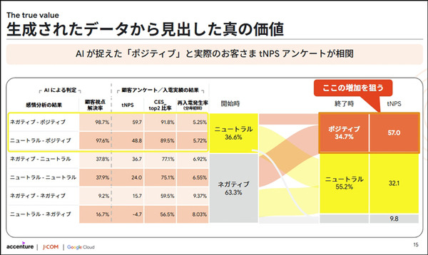 「JAICO」の特徴的な取り組みとして「感情分析」がある。通話の冒頭と終了時にAIがユーザーの感情を分析して「ネガティブ」「ニュートラル」「ポジティブ」の3段階で評価。冒頭と終了時の感情の変化を分析することで、顧客満足度の解析と理解、応対品質の向上へのノウハウを蓄積している。