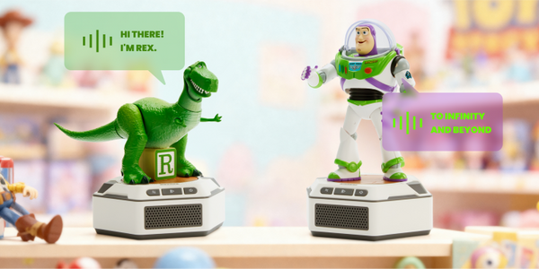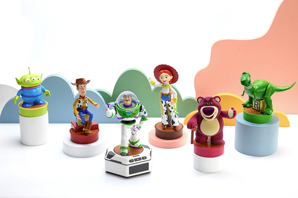キャラクターをベースに嵌めると、動きながら喋り、キャラクター特有の様々なアクションとサウンドが再生される。1つのベースでキャラクターの入れ替えが自由で、ベースにある3つのボタンで、アクションの再生、音量調整、再生モードの切り替えが簡単に操作可能だ。アプリも不要、面倒な設定も必要なく、ボタンを押すだけで楽しめる。