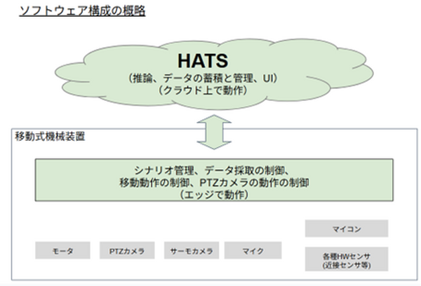 また、キビテクが提供するHATS(Highly Autonomous Teleoperation Service:ロボット用の汎用の遠隔制御プラットフォームを起点として、ロボット用の要素技術の統合されたプラットフォーム)を活用し、遠隔制御機能をシステムに付与した。点検地点でのデータ採取後にクシナダ機巧が開発した推論処理部がデータを解析し、異常検知時は遠隔地のオペレーターに通知する。データは蓄積・分析支援も可能だ。