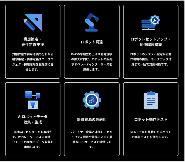 同社は、AIロボットデータソリューションとして、視覚情報と自然言語指示を統合し物理的な行動を生成するVLAモデルの研究開発に必要な大規模データの生産を推進している。これにより、AIロボティクスの開発を進める企業や研究機関に対して、学習データ提供から開発支援まで幅広くサポートすることを目指す。