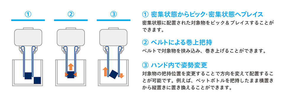 独自のベルト機構と力制御技術により、多様な形状・材質の対象物をやさしく把持できる柔軟な動作を実現した。また、把持したまま回転することで対象物の向きを変更し、整列させてプレイスできる。
