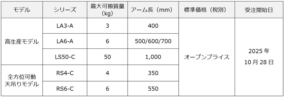 エプソン販売株式会社は、産業用ロボットの新商品としてスカラ(水平多関節)ロボットの『LA3/6-A』シリーズ、『LS50-C』シリーズ、『RS4/6-C』シリーズを2025年10月28日(火)より受注開始すると発表した。同時に、産業用ロボット専用の定額保守サービスの受注も開始する。