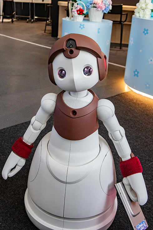 人を見つけると、穏やかなまなざしをパチパチと瞬かせながら近づき、ゆっくりと語りかけてくれる。そんな「やさしいインタラクション」が特徴だ。手にはタブレットを装備し、画面に表示された画像や映像を使いながら、楽しい話をしてくれる。