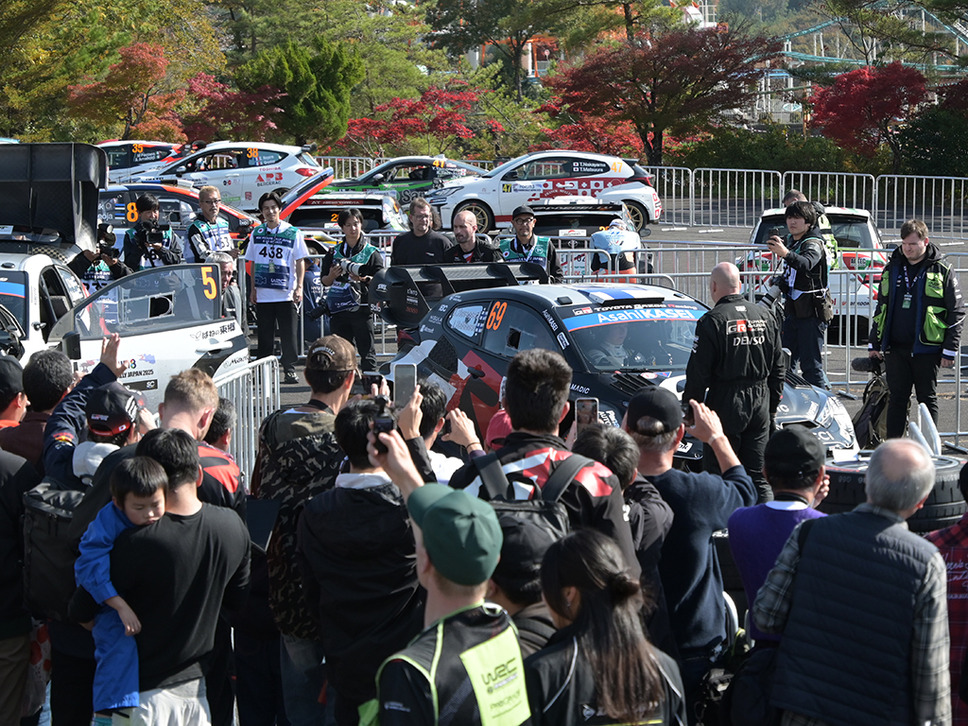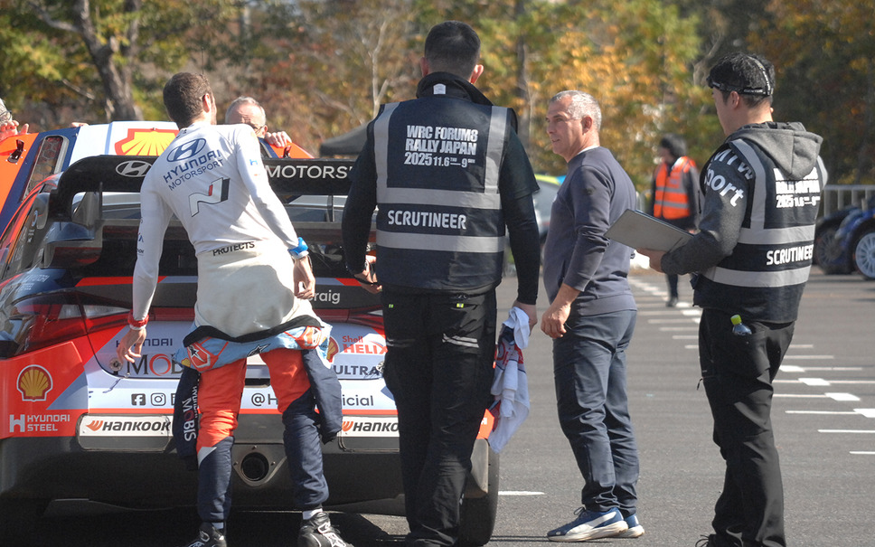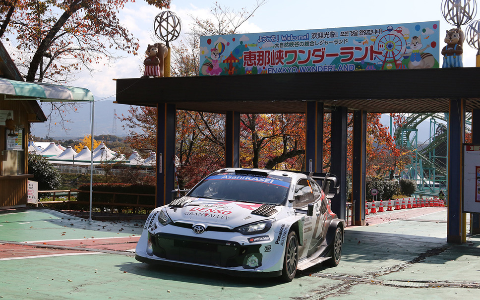 WRC「フォーラムエイト・ラリージャパン2025」の3日目の8日は舞台を岐阜県に移した。レジャー施設「恵那峡ワンダーランド」にはタイヤ・フィッティングゾーンが設置され、午前中に山岳ステージ(SS8~SS10)を走り終えたラリーカーが続々と到着した。