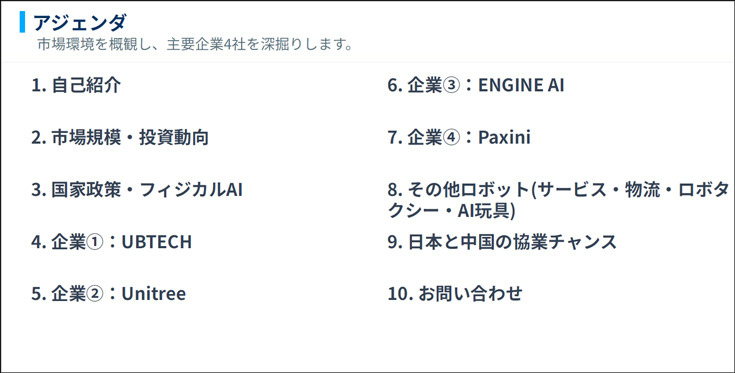 中国の工場での各種ロボットの導入状況や、物流・配送分野における自動化、ホテルや飲食店での接客ロボットの広がり、さらにはヒューマノイド開発の最前線や、ビジネスパーソンや消費者の受け止めまで、ビジネスパーソン向けに幅広くカバーして頂きました。