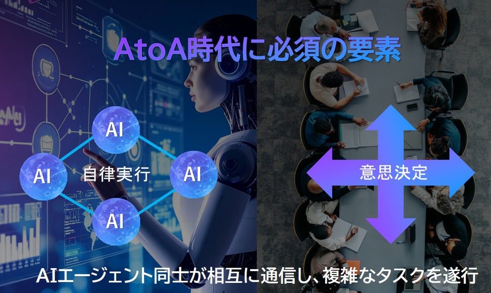 登壇した本部長の上原氏は「現在、社員ひとりひとりに複数の「AIエージェント」が作られ、部門ごとのシステム向けにAIエージェントが作られ、それらが会話をしながら自律的に実行する世の中が実現しています。A2A(エージェントtoエージェント)とも言われていますが、これらAIエージェント同士が自律的に作業を実行し、意思決定を促していくシステムが重要になってきます」と語った。