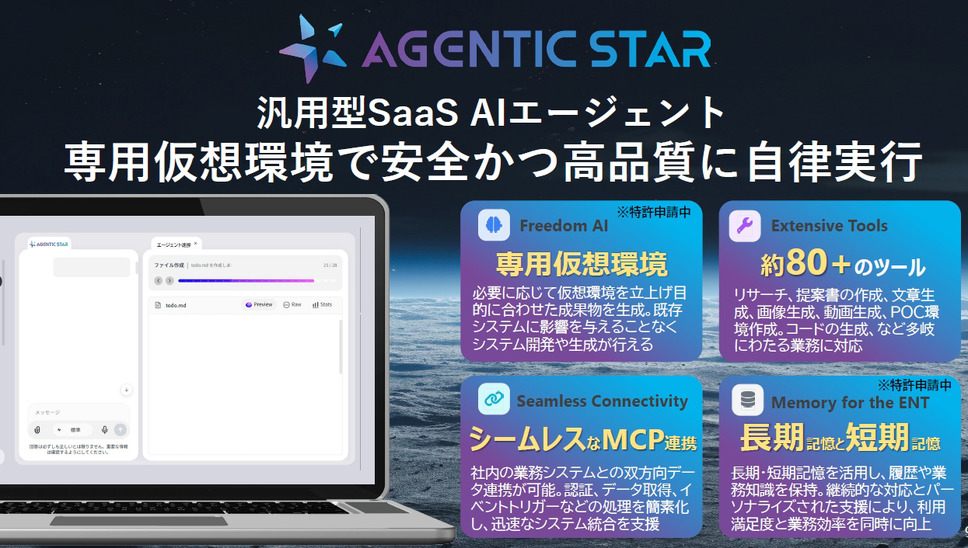 「AGENTIC STAR」には80種類以上のツールが用意され、ウェブ検索、文書、表計算、プレゼン資料、画像・動画、アプリケーション開発まで、単一のプラットフォームからシームレスに成果物を生成できる。用途に応じてツールを自律的に使い分けることで、完成度の高い成果物の作成と生産性向上に寄与する。
