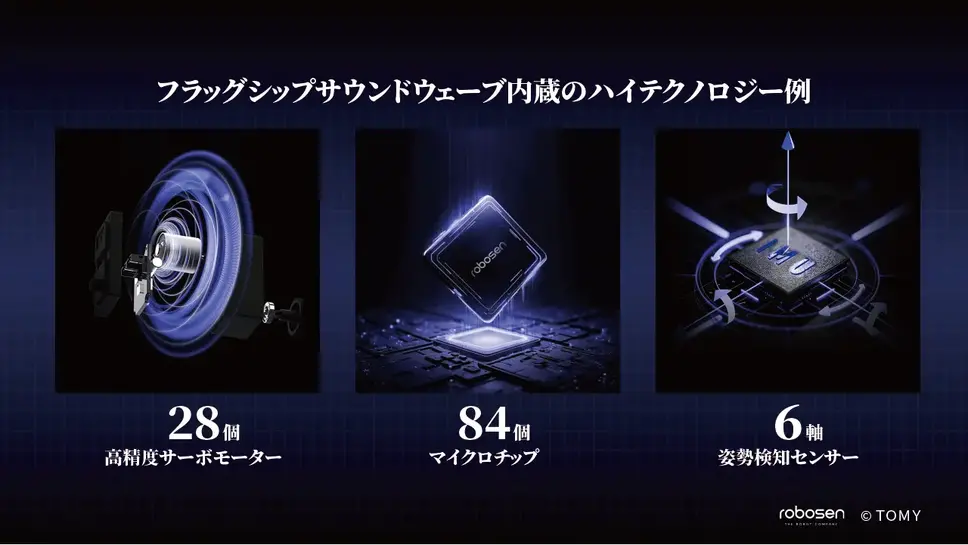 28個の高精度サーボモーター、84個のマイクロチップ、6軸姿勢検知センサーを搭載し、精密な変形制御と安定した動作を実現する。