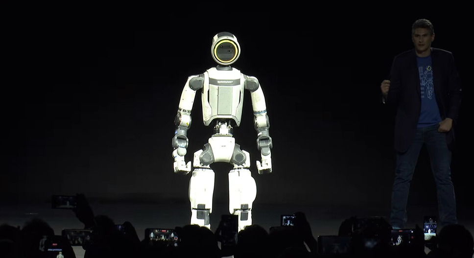 ただ「Atlas」は人と完全に同じように動くことを目的とはしていない。安定性と効率を最優先した設計を採用したデザインをステージ上で披露。首や腰などの関節は360度回転でき、触覚付きの人間サイズの手、全方位カメラを備えていることを示した。