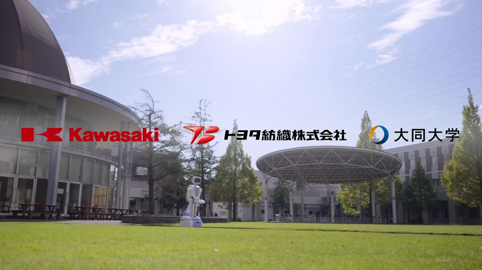 ロボットの下部にはKawasakiのロゴが確認でき、川崎重工の技術力が投入されていることがわかる。また、側面にはToyota Boshoku Corp.のロゴも見られ、両社の協力体制が明確に示されている。