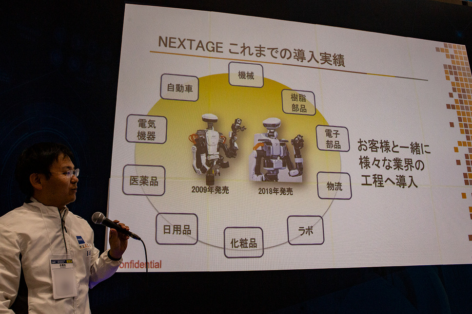 一方のカワダロボティクスの講演タイトルは「人と一緒に働くヒト型ロボット"NEXTAGE"が拓く新しい働き方」。同社が長年にわたって取り組んできたヒューマノイド開発の歴史(二足歩行型を含む)を振り返りながら、上半身ヒューマノイド「NEXTAGEシリーズ」の実運用事例を紹介。