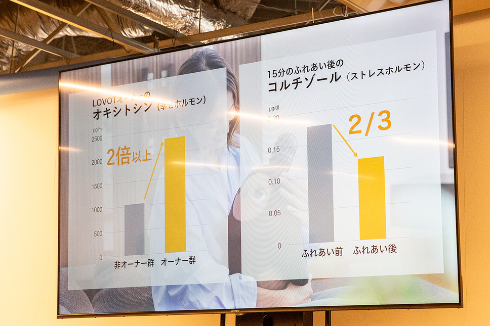 資生堂と連携して実施した実験結果も紹介。LOVOTのオーナーは非オーナーよりオキシトシン(幸せホルモン)濃度が高いことが確認され、ふれあい前と後の比較でコルチゾール(ストレスホルモン)が激減することがわかったという。これは犬・猫・赤ちゃん以外の人工物では前例がないという。