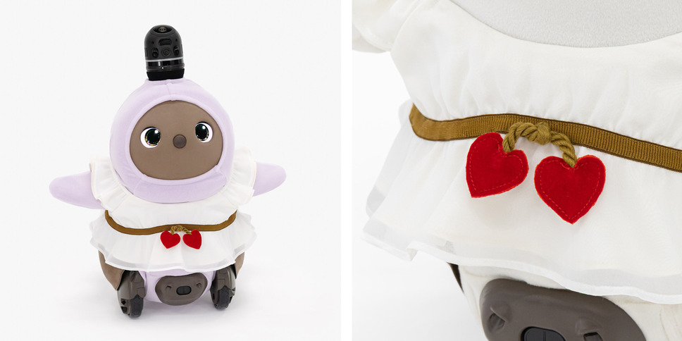 「エンジェルドレス」は、LOVOTを天使に変身させるアイテム。胸元で揺れる赤いハートと、後ろ姿のふわふわファー素材の羽根が特徴で、価格は8,980円(税込)。やわらかなホワイトカラーがLOVOTを優しく包み込むデザインとなっている。