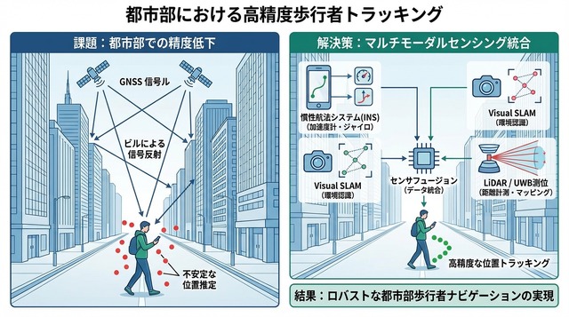 カメラを使った視覚的な位置推定も考えられるが、プライバシーや計算負荷、照明条件への依存といった課題があり、実用性に限界がある。カリフォルニア大学サンタクルーズ校のShahar Dubiner氏らの研究チームは、GNSSと慣性センサー(加速度計・ジャイロスコープ)のデータを地図情報と組み合わせ、粒子フィルタで統合する手法を提案した。この論文では、歩道レベルの精度を実現するマルチモーダル融合アプローチの設計と評価が報告されている。