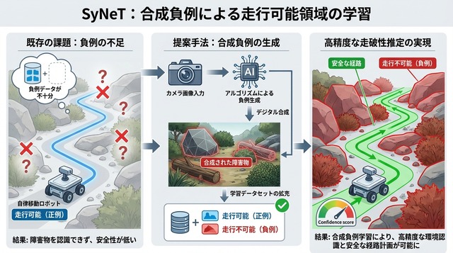 自律走行ロボットが屋外の複雑な環境を安全に移動するためには、道が通れるかどうかを判断する「走破性(そうはせい)」の推定が重要である。カーネギーメロン大学のBomena Kim氏らの研究チームは、この走破性学習の精度を高める新手法「SyNeT(Synthetic Negatives for Traversability Learning)」を発表した。
